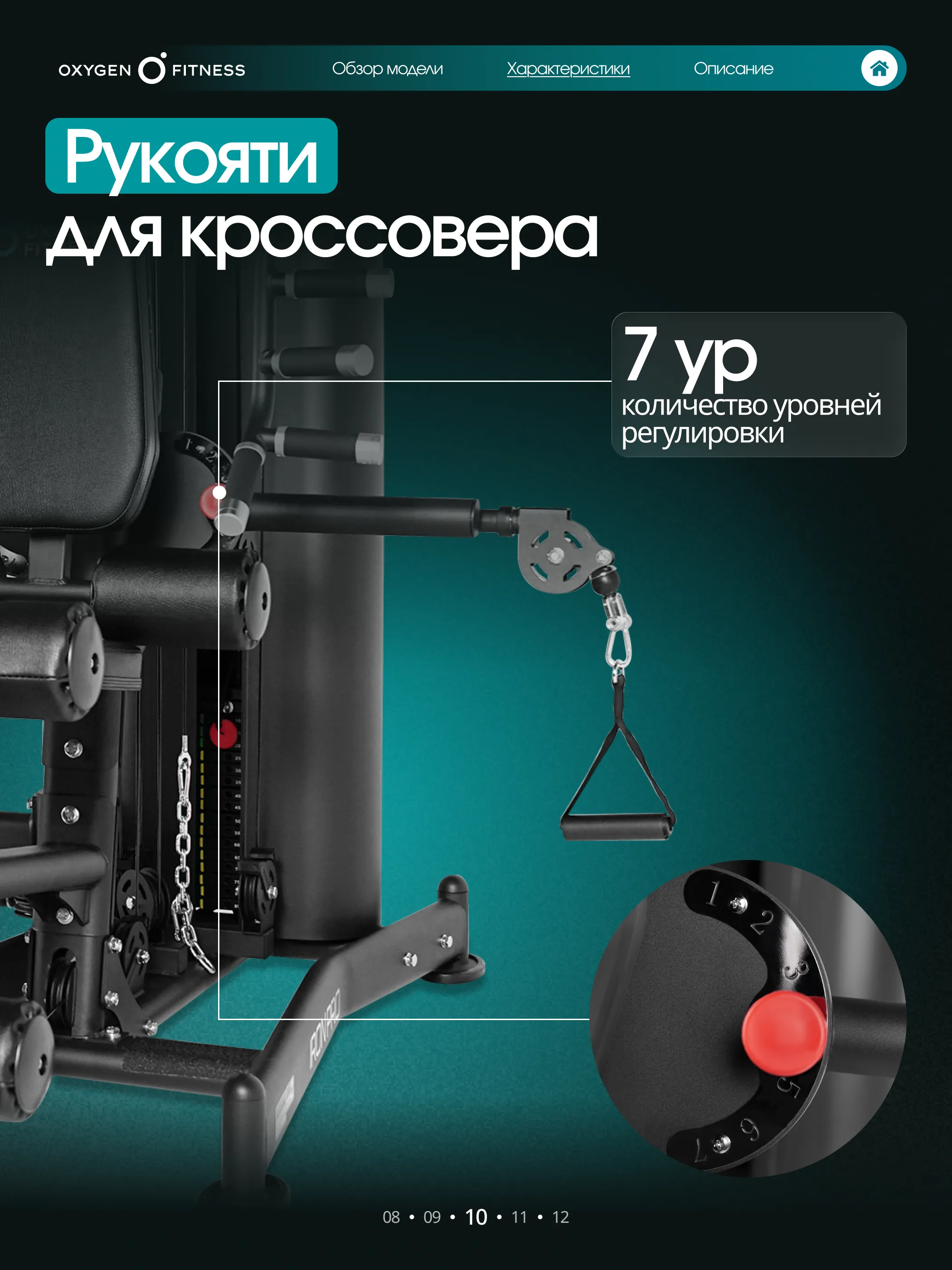 Мультистанция позволяет быстро адаптировать тренажер под рост и тип упражнения благодаря большому количеству регулировок: • рукоятки — 7 уровней • спинка — 5 уровней • сиденье — 5 уровней по высоте • блок жима от груди — 10 уровней