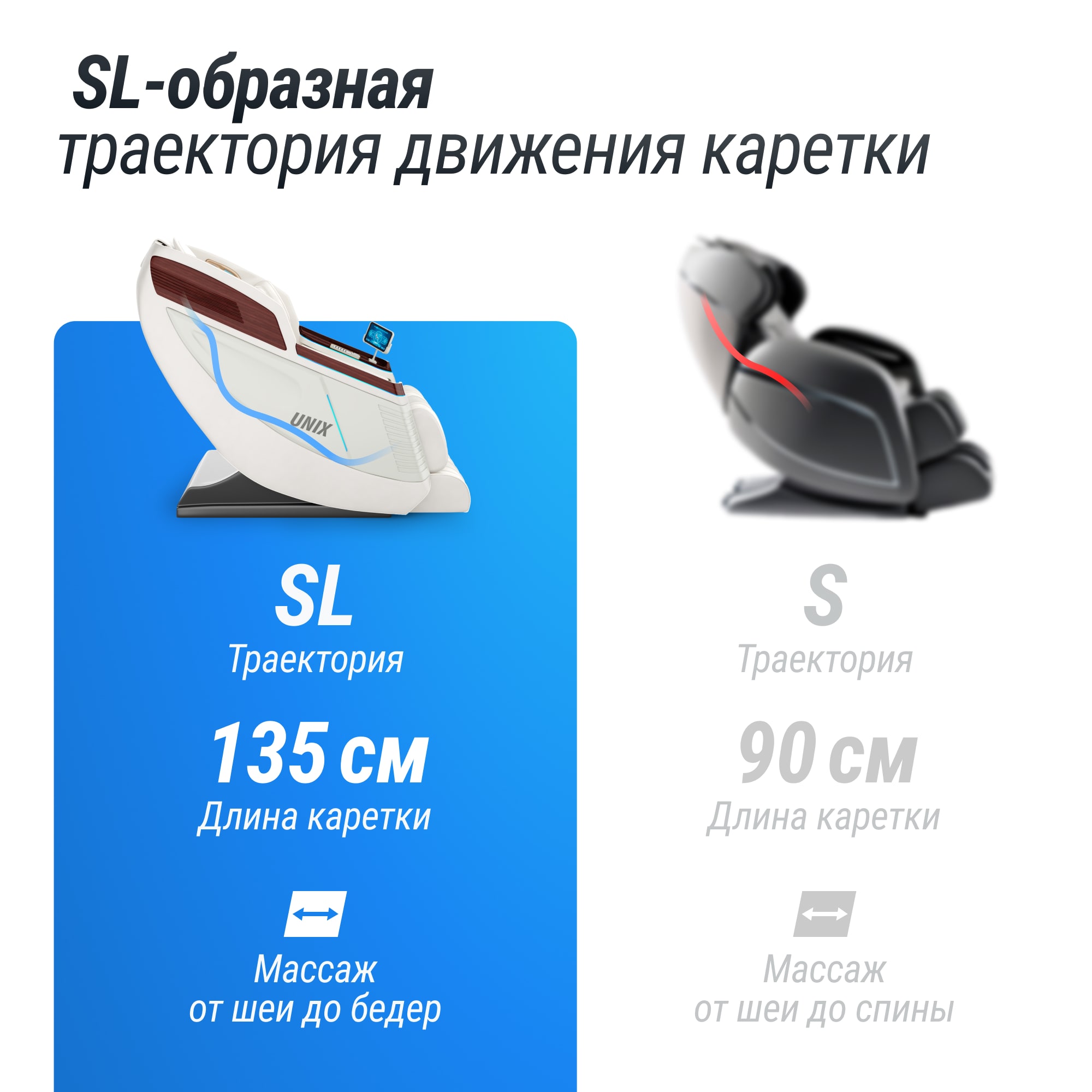 - SL-образная каретка с областью воздействия от шеи до бедер длиной 120 см. Каретка входит в состав блока массажного кресла и отвечает за интенсивность работы роликов. Чем она длинней, тем больше участков тела массируется. SL-образная каретка — это самая новая вариация каретки для более качественного и глубокого массажа. Охватывает больше участков тела, в нее встроены ролики, которые движутся от шеи до бедер. Эргономичный дизайн конструкции каретки выполнен с учетом всех потребностей, которые возникают при массаже в кресле, она идеально подходит под изгибы тела. Прорабатывает область от шеи до бедер и ягодиц и вы ощущаете всю полноту массажа, а ваши мышцы расслабляются. Подлокотник в форме космической капсулы, с обеих сторон которого встроены 8 подушек безопасности для волнового массажа