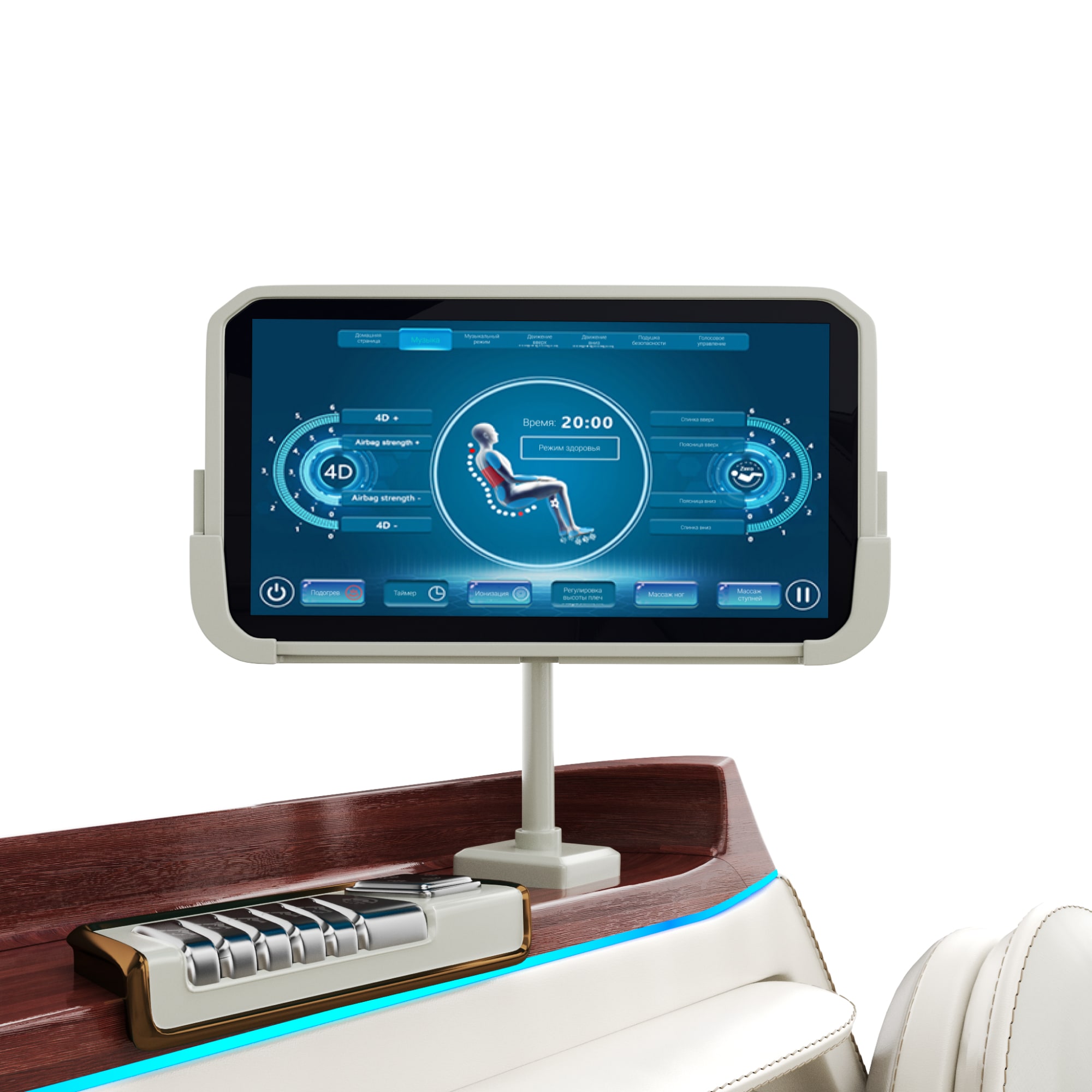 - Управляйте с легкостью! Интуитивно понятный сенсорный пульт управления в виде планшета с кнопками быстрого управления и голосовой системой управления Al располагается на подлокотнике. Массажное кресло оснащено поворотным переключателем для управления программами массажа, регулировкой интенсивности массажа; регулировкой подъема голеней, спинки; регулировкой угла наклона кресла в режиме нулевой гравитации. Функция памяти для 6 пользователей и прочие данные о режиме массажа. Настройки позволяют отрегулировать общие параметры устройства в соответствии с потребностями пользователя массажного кресла: время массажа, звук кнопок, подсветка, Bluetooth, язык. Широкий диапазон изменения уровня давления и времени поможет настроить массажный механизм под свои потребности.