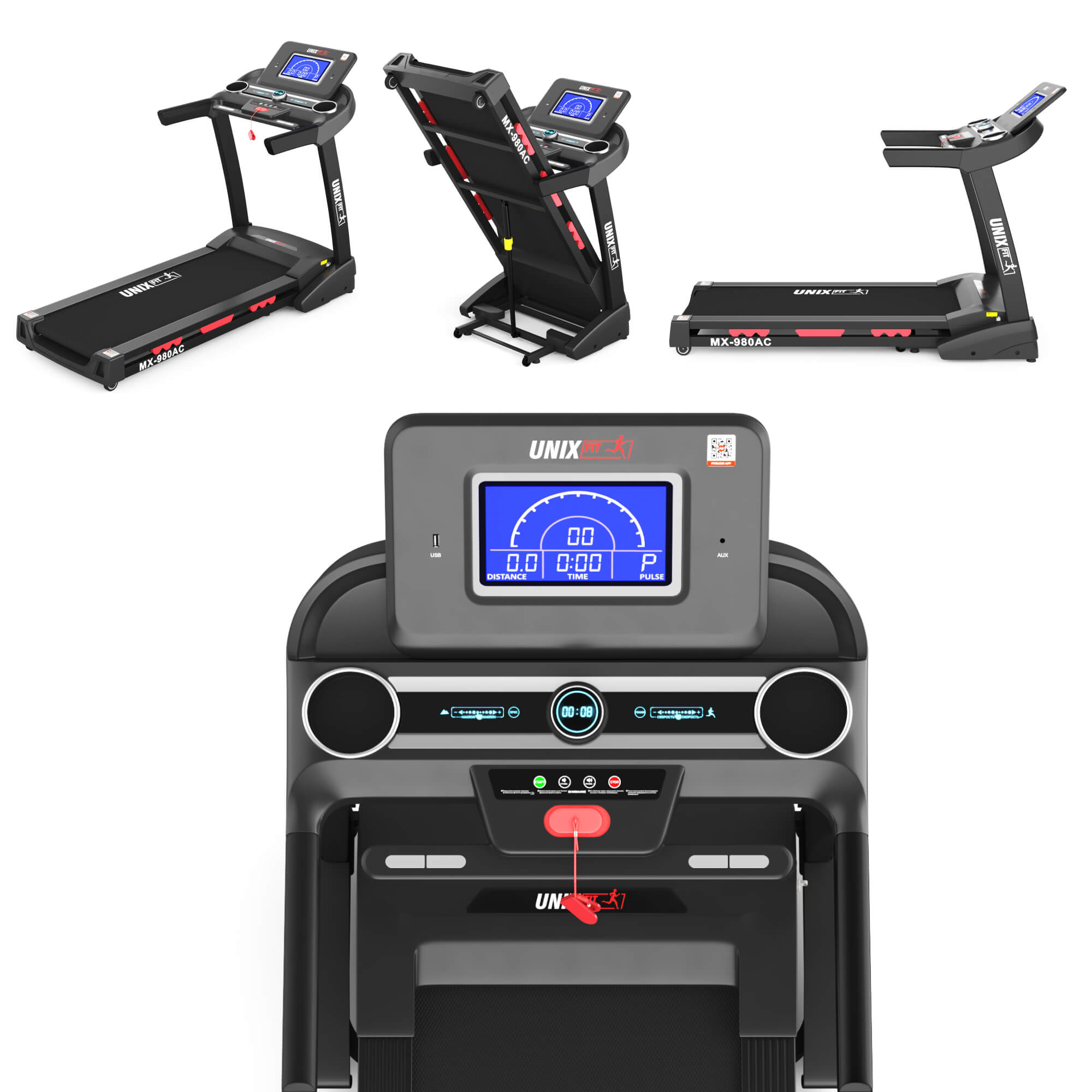 Кардио тренажер для похудения для дома и зала имеет крепления для бутылки, два стереодинамика для прослушивания музыки, интерфейс Bluetooth и разъемы USB/AUX для соединения внешних устройств воспроизведения мультимедиа. Складная беговая дорожка рекомендована лицам с массой тела до 140 кг и подходит для регулярных высокоэффективных аэробных упражнений.