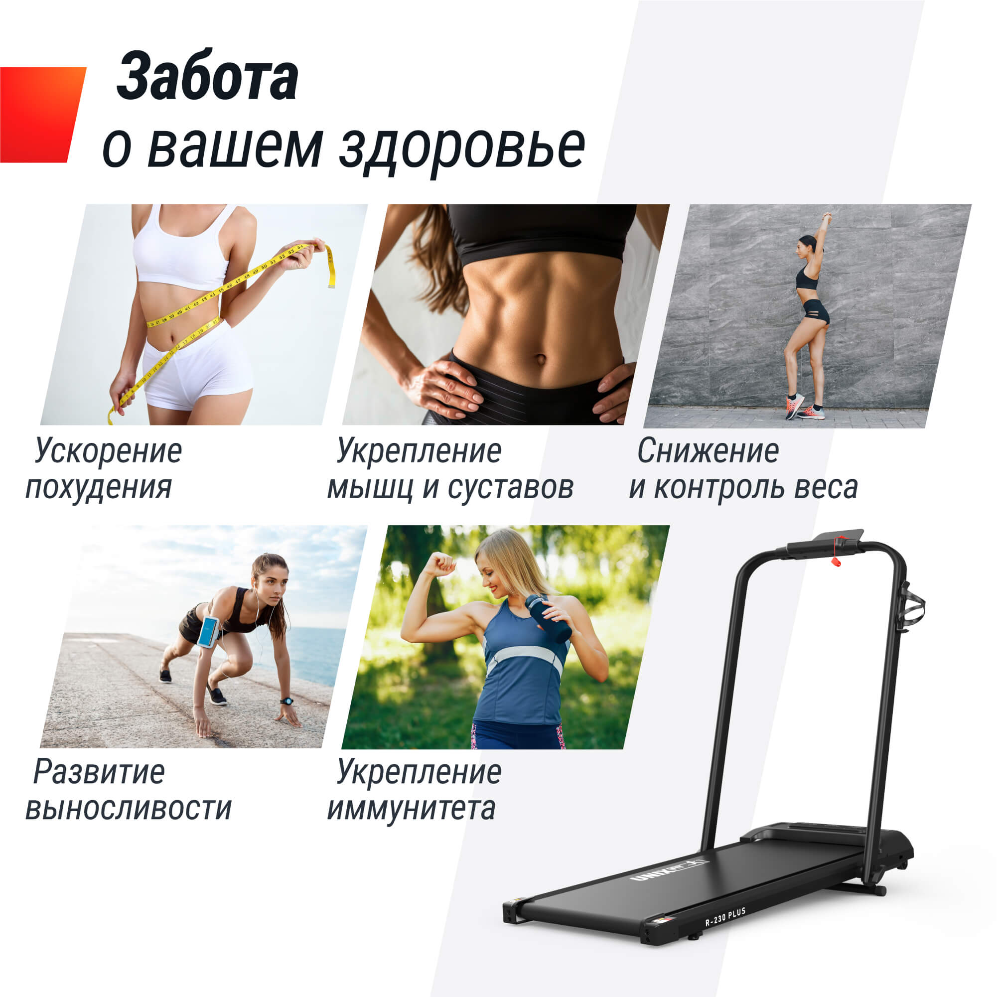 Приобретая беговую дорожку UNIX Fit R-230 PLUS, вы получаете доступ к профессиональным технологиям, современным материалам и инновационным решениям, которые позволят вам вести активный образ жизни и заботиться о своём здоровье каждый день, оставаясь энергичными и бодрыми круглый год.