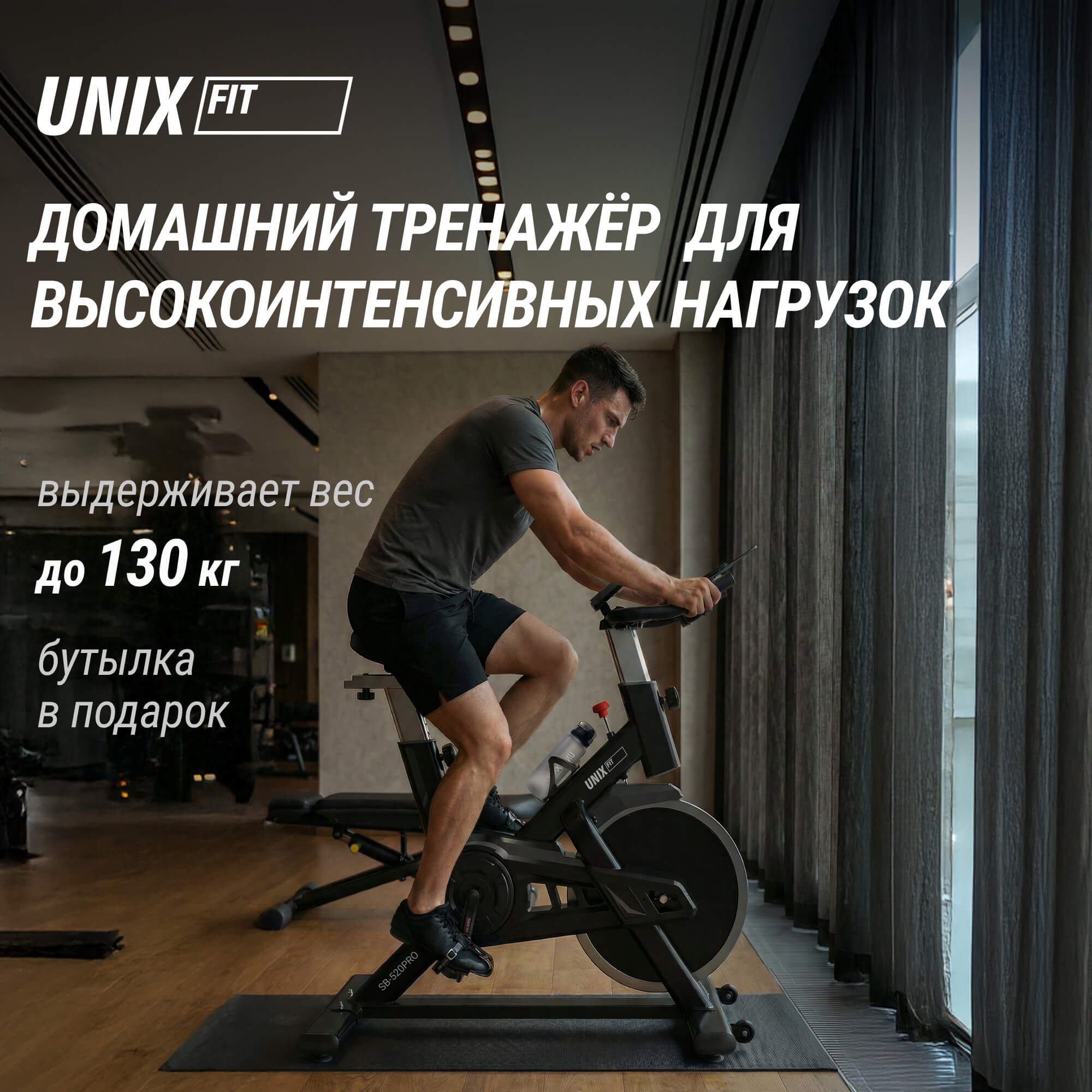 - Оснащение. Спортивная бутылочка с держателем обеспечивают дополнительное удобство при длительных кардио тренировках на тренажере. Встроенные компенсаторы неровности пола гарантируют устойчивость во время интенсивного тренинга. Резиновые ножки не позволят испортить напольное покрытие, даже при длительном интенсивном использовании тренажёра на одном месте. Специальные транспортировочные ролики позволят без труда перемещать спин байк по квартире и дому.